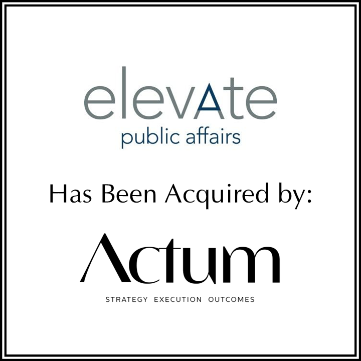 “Actum is relentlessly focused on delivering real business results through a sharply differentiated platform and ensuring that our clients win,” said Becky Warren, Principal and Co-Founder of Elevate Public Affairs. “California’s economy is the fourth largest in the world, and the consulting model developed by Actum—where the focus is on senior people, deeply engaged at every touchpoint, solving incredibly nuanced challenges—is a perfect fit for Elevate,” added Elizabeth Hansell, Principal and Co-Founder of Elevate Public Affairs.